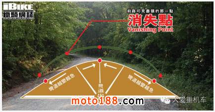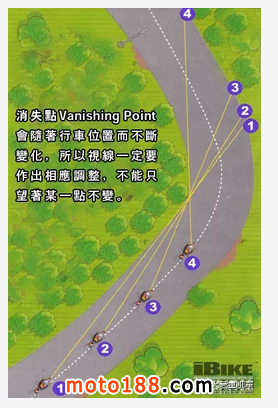 當「消失點」開始偏離中間點,游向視野兩旁時,表示人車開始接近彎道。「消失點」越向旁邊移動,代表彎道越急。當「消失點」移向中間時,代表接近彎道出口,在應付連續的陌生彎道時,我們只要依隨著以下的原則,對應著「消失點」的變化便可提升攻彎的流暢度: