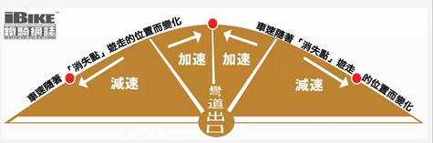 如果入彎前的車速是在駕駛者所能應付的能力之內的話,「消失點」會和駕駛者穩定地保持著一定的距離,大部份情況都會是兩、三個車位的距離。但若果駕駛者的轉 向能力未能及時消化彎道的變化時,「消失點」便會急速地向駕駛人的方向靠近,代表入彎速度過高,超出騎士本人的轉向能力,減速是唯一辨法,否則人車恐怕會 沖出彎道之外.....