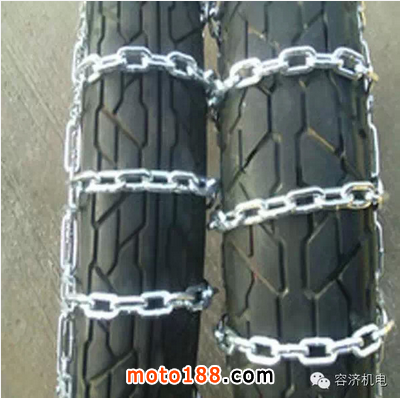 摩托車防滑裝置,是一種摩托車防滑鏈,由防滑壁、連接鏈、固定拉環(huán)組成,防滑壁是由金屬卷制呈相對弓形頂端呈外旋螺紋狀,防滑壁之間用連接鏈連接,防滑壁弓形頂端固定有固定拉環(huán),用兩條固定拉線分別間隔穿過固定拉環(huán),在摩托車輪胎兩側(cè)分別擰緊緊固鎖,使防滑鏈固定在摩托車輪胎上,在坡度小于三十度的雪地、冰面上行駛安全可靠,防滑鏈對摩托車輪胎沒有任何損傷。