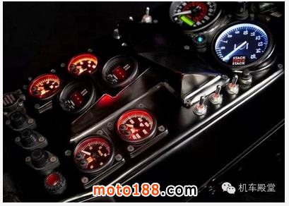 金屬置地的儀表盤放置在油箱上部,這一點和B組的拉力車很相似。方便讀取溫度,油壓,速度,轉速和電壓。線路都包裹在機身周圍,猶如金蛇纏繞。