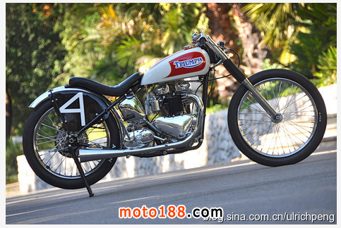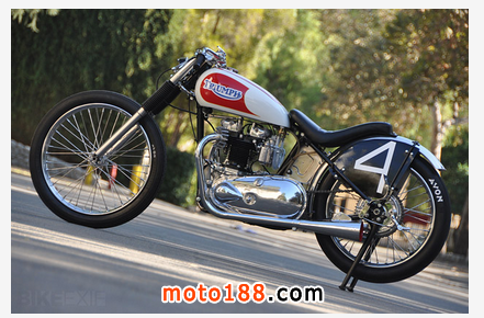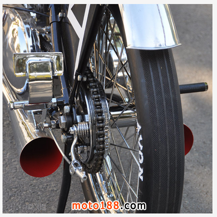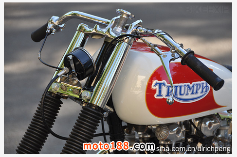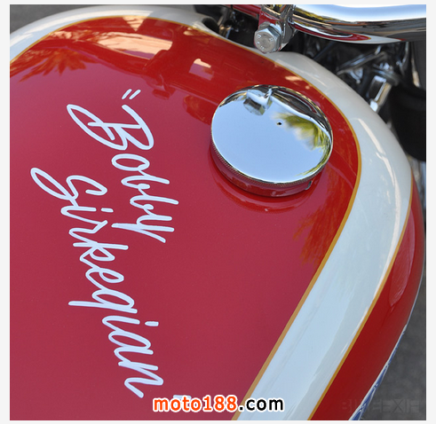 這臺(tái)1951年出廠的凱旋雷鳥(niǎo)被Sirkegian翻修一新,但完全保留了當(dāng)年的原貌。當(dāng)初為了適應(yīng)南加州賽車(chē)協(xié)會(huì)SCTA的要求,整車(chē)的動(dòng)力系統(tǒng)都被加以強(qiáng)化,發(fā)動(dòng)機(jī)在拓缸后換上了特制的040大尺寸曲軸連桿和小號(hào)的正時(shí)齒輪,改裝的缸頭為發(fā)動(dòng)機(jī)增加了進(jìn)氣和排氣量。這臺(tái)雷鳥(niǎo)當(dāng)時(shí)參加的是650cc組別的直線競(jìng)速,如今我們開(kāi)來(lái)倒是臺(tái)很拉風(fēng)的美式Bobber,尤其是將排氣管里面漆成紅色,真是悶騷到了極點(diǎn)。這不最近時(shí)裝設(shè)計(jì)師 Christian Louboutin 就正在和圣羅蘭YSL因紅色高跟鞋底的設(shè)計(jì)專(zhuān)利打著如火如荼的官司,看來(lái)全世界的男人真的都很喜歡這種驚鴻一瞥的美感。