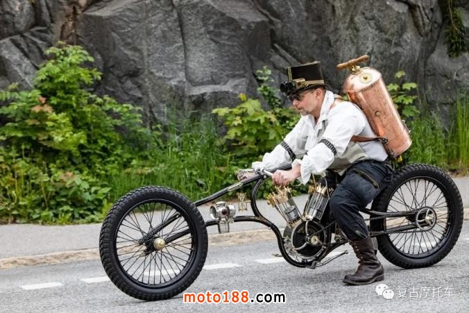 駕駛這輛蒸汽朋克摩托車并不輕松,因為它有一個奇怪的轉(zhuǎn)向機構(gòu),除此之外,這輛車在騎行的時候,還要將沉重的壓縮空氣瓶背在背上,而且即使它充滿氣也只能夠行駛5分鐘。不過,作者下一步有計劃再開發(fā)一個邊車來攜帶氣罐。