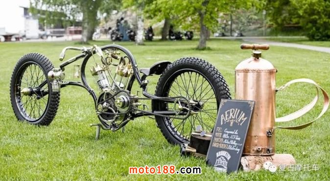 一輛完全從零打造的蒸汽朋克風(fēng)格摩托車,依靠壓縮空氣推動發(fā)動機工作。這輛兩輪車最引人注目的是它可見的機械部件。我們可以通過安裝在摩托車中部的玻璃氣缸看到活塞、密封件、閥門和推桿。作者借用了一輛舊哈雷摩托車的曲軸,打造了這個神奇的發(fā)動機。