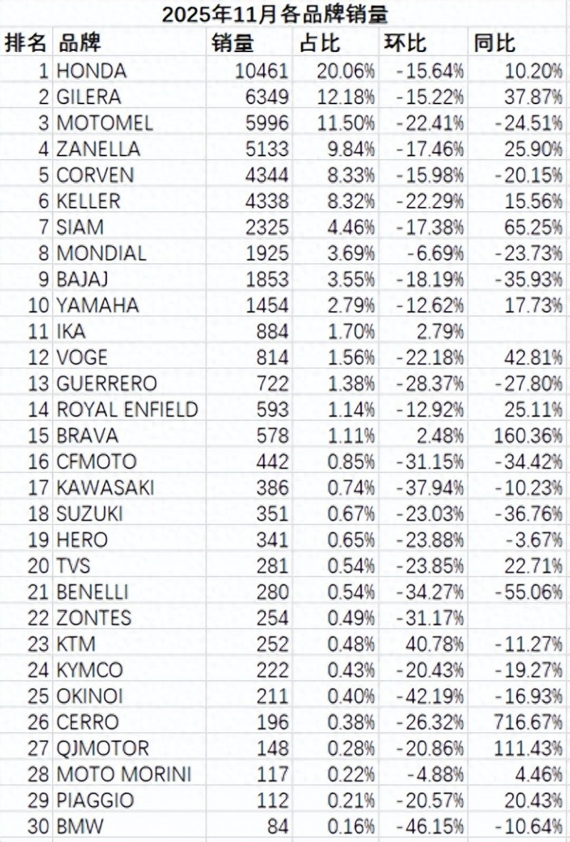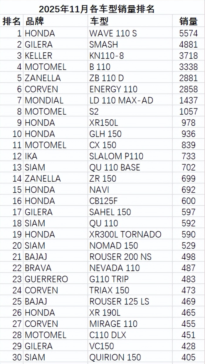 2025年11月阿根廷摩托車市場銷量快報